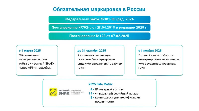 В Российской Федерации с 2025 года значительно расширяется перечень товарных групп, подлежащих обязательной маркировке. Базовые законодательные документы включают ФЗ-381 в редакции 2024 года и ряд постановлений в редакции 2025 года.