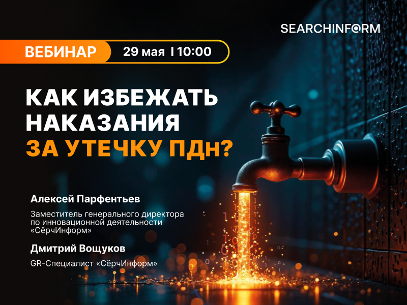 29 мая в 10:00 состоится вебинар «Как избежать наказания за утечку ПДн?». Заместитель генерального директора по инновационной деятельности «СёрчИнформ» Алексей Парфентьев и GR-специалист «СёрчИнформ» Дмитрий Вощуков расскажут про особенности нового закона и объяснят, какие компании подпадут под его действие. А самое главное – разберут, как снизить юридические последствия утечки ПДн, а иногда – исключить их совсем.