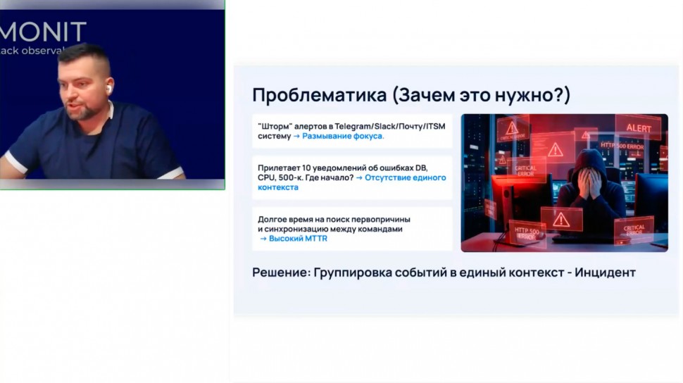 Спикер пояснил, что системы генерируют десятки уведомлений в Telegram, Slack, почту или ITSM-систему, и команды часто теряются в потоке сигналов. Приходит множество уведомлений об ошибках баз данных, CPU или HTTP 500, невозможно понять, где начало проблемы, отсутствует единый контекст, а поиск первопричины сбоя затягивается, что ведет к высокому MTTR.